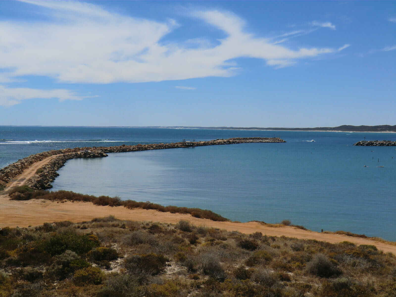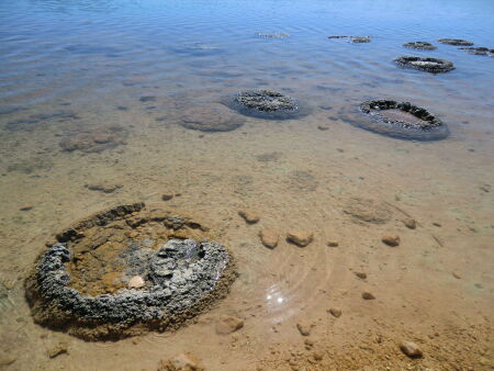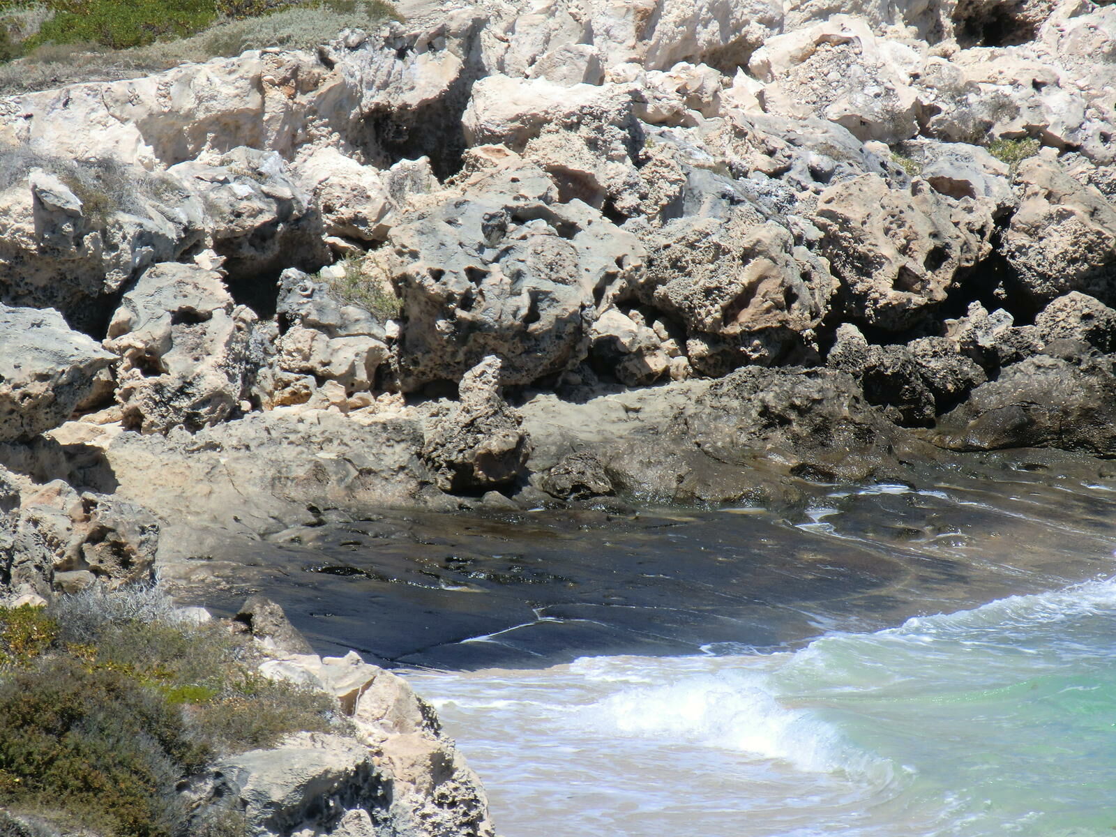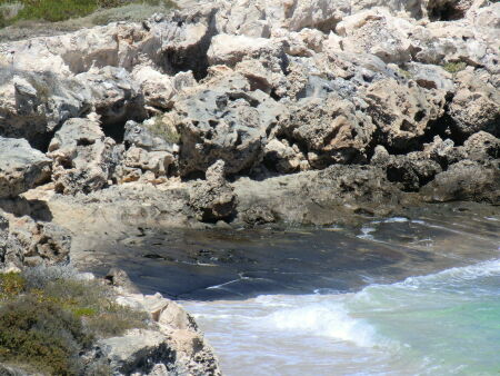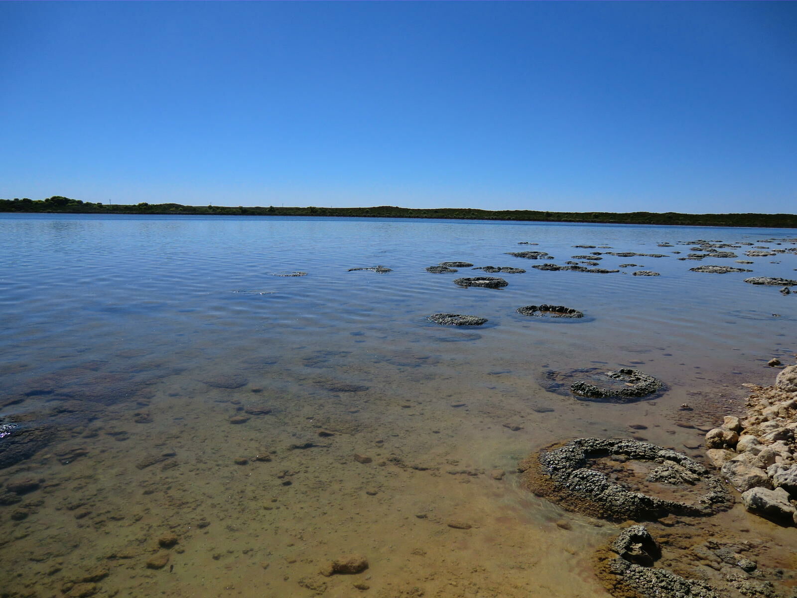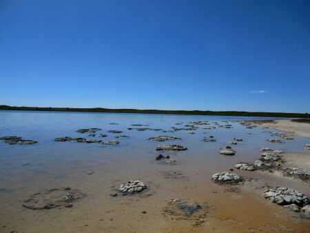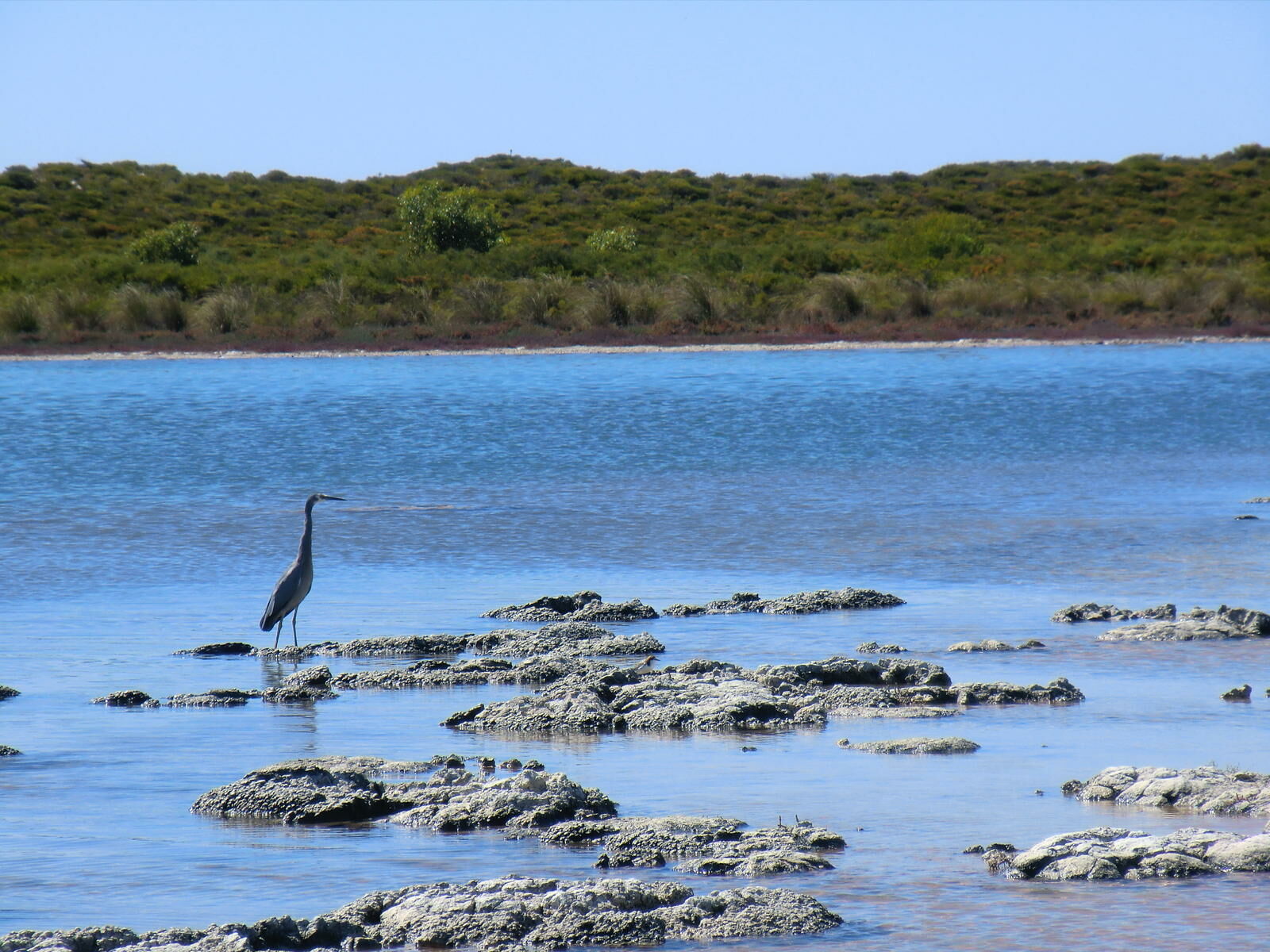 After a night with little sleep, it was loud and could, we went northwards. First we drove a bit back as I had seen a road sign pointing to stromatoliths (living rocks). A sand road leads to Lake Theatis and the stromatoliths and we raised a lot of dust. A short path and boardwalk lead to the stomatoliths. We saw those rocks formed by micro organisms partially in the water and partially on the land. When we arrived a cormorant flew away. We hoped he would return as he would be nice on a photo. How should it be, after a while the bird came back. Our trip led with short photo stops to Jurie Bay. Here we granted our feet a cool bath in the sea. At time there is often a warm wind which makes the temperature more bearable, but we do not feel then how strong the sun is burning. On the way I stopped shortly to take pictures of trees which were partially burned from the last bush fire. When leaving the car I hit a wall of heat. We decided to drive to Geraldton As it was already late afternoon. At the tourist information we realized that the roof of the car was not completely closed. A closer look revealed that a clamp was missing. With the help of a ladder we saw that the moveable strut was bent and thus the roof could not anymore be closed completely. Many bird voices accompanied us on this carpark. In the trees we saw many white parrots. After we went directly to the camping to stay there overnight. The owner gave us the hint to immediately call Apollo and to explain the problem. Sandra called as her English is better. They explained us that it is too late to send someone to have a look. The office would contact us tomorrow. With a fine dinner and Australian wine we finished this evening.