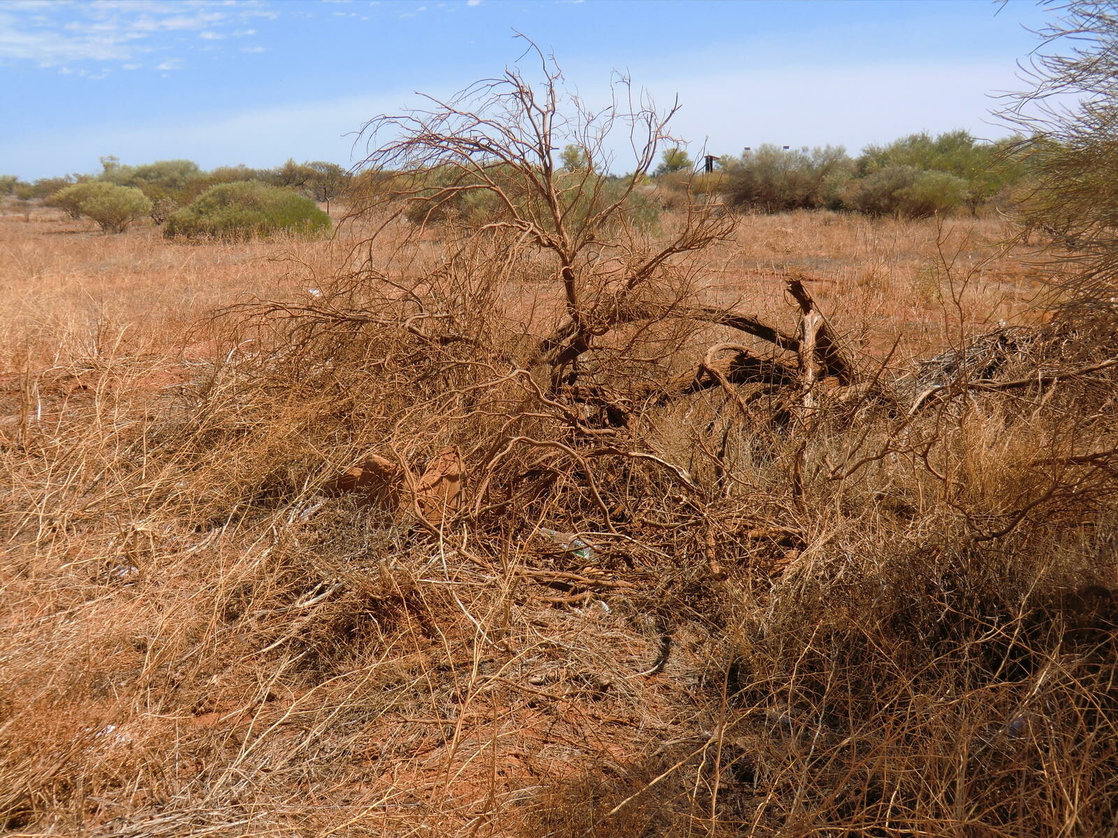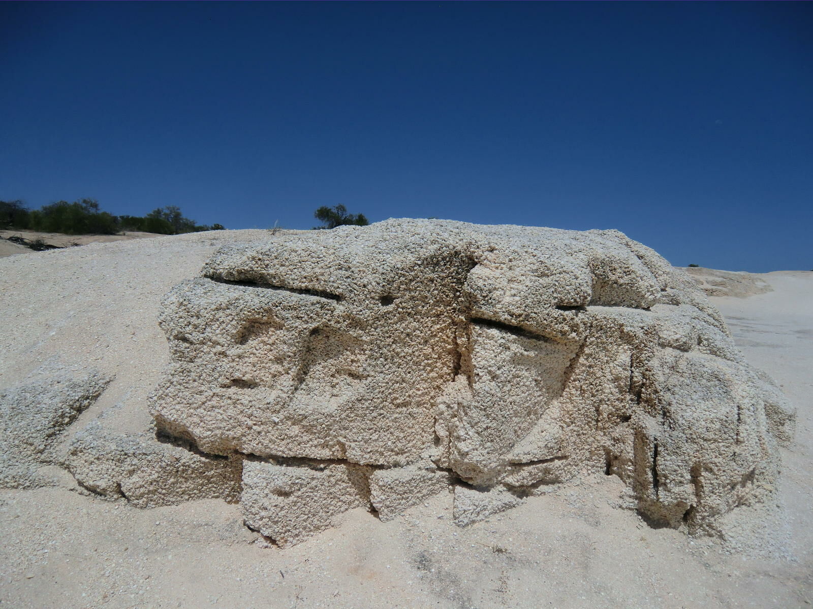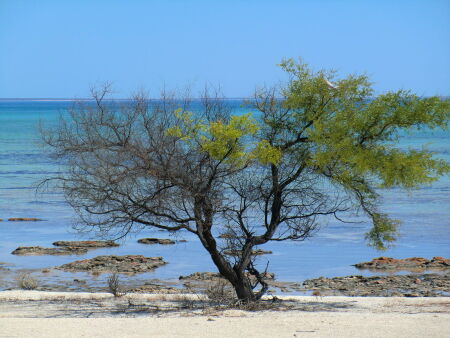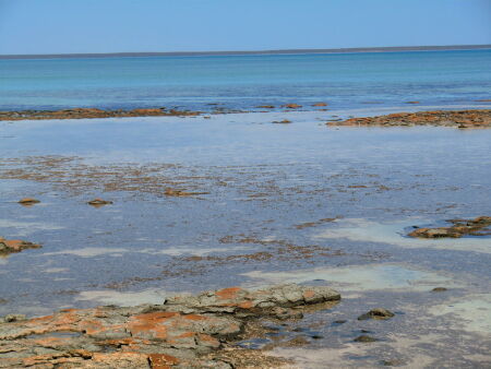 We got up already at 6am as a long day was waiting for us. First I called my travel agency in Sydney to tell them about our problem with Apollo. Allegedly we were unfortunate. They look now how Apollo may compensate us for the lost time. We just passed Kalbarri as we had already booked the camping in Monkey Mia. We will come back later. We drove a never-ending road through the outback to the Hamelin Pool and visited the stromatoliths. At the rocks there was an emu accompanying us. As we watched the shore we observed tourists walking on these living rocks which is forbidden. I think they also do not like to be kicked in the face! On the way back to the camper I saw a kangaroo jumping away, but not without shortly stopping for a picture. It was 40° C in the shadow and the heat made us tired. So we decided to drive without stop to Monkey Mia. There arrived we made first a break and drunk litres of water. In the resort emus were walking around. Towards the later afternoon we drove to the Francois Peron National Park. Only 4WDs are allowed on this road and the it got more and more sandy. We got a bad feeling and turned. As soon as we had turned the car we became stuck in the sand. Luckily there are saving angels. Two kind Australians explained us, that we should have let off air from the tires. Somehow we did not consider a sign at the entrance. They helped us and then they followed us until the park entrance. Somehow we cannot do it without adventures.