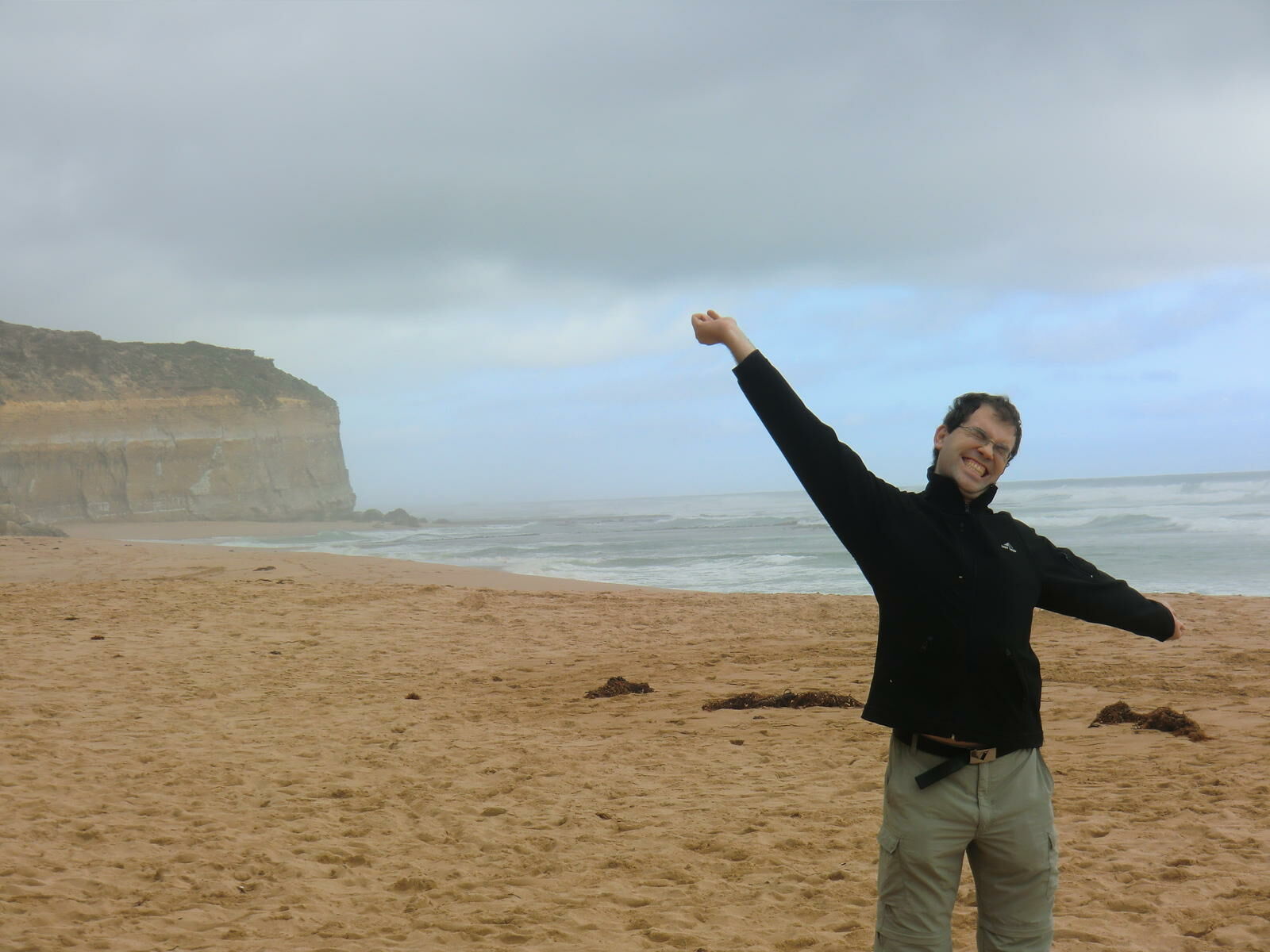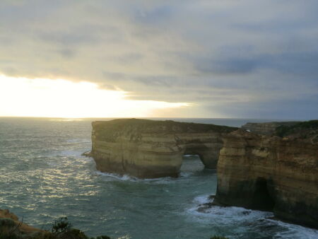 Nun waren wir schon nah an den wichtigsten Sehenswürdigkeiten der Great Ocean Road. Zuerst stiegen wir bei Gibson Step die Klippe zum Strand hinab und genossen den Anblick auf die schroffen Küstenfelsen. Kaum richtig losgefahren, empfingen uns die 12 Apostel, inzwischen nur noch 8 im Meer freistehende Felsen. In Zwischenzeit war es nicht mehr so sonnig wie in den letzten paar Stunden. Es ging ein paar Meter weiter zum Loch Ard Gorge. Umso länger wir an diesem Ort waren, umso schöner wurde das Wetter. Nach einem doch noch schönen Sonnenuntergang ging es weiter nach Port Campell. Konrad erklärte mir, dass ich ihm sagen soll wenn ich ein Känguru sehe. Kaum sind wir losgefahren stand doch wirklich ein Känguru auf der Strasse. Nun ist es klar: wir sind in Australien!