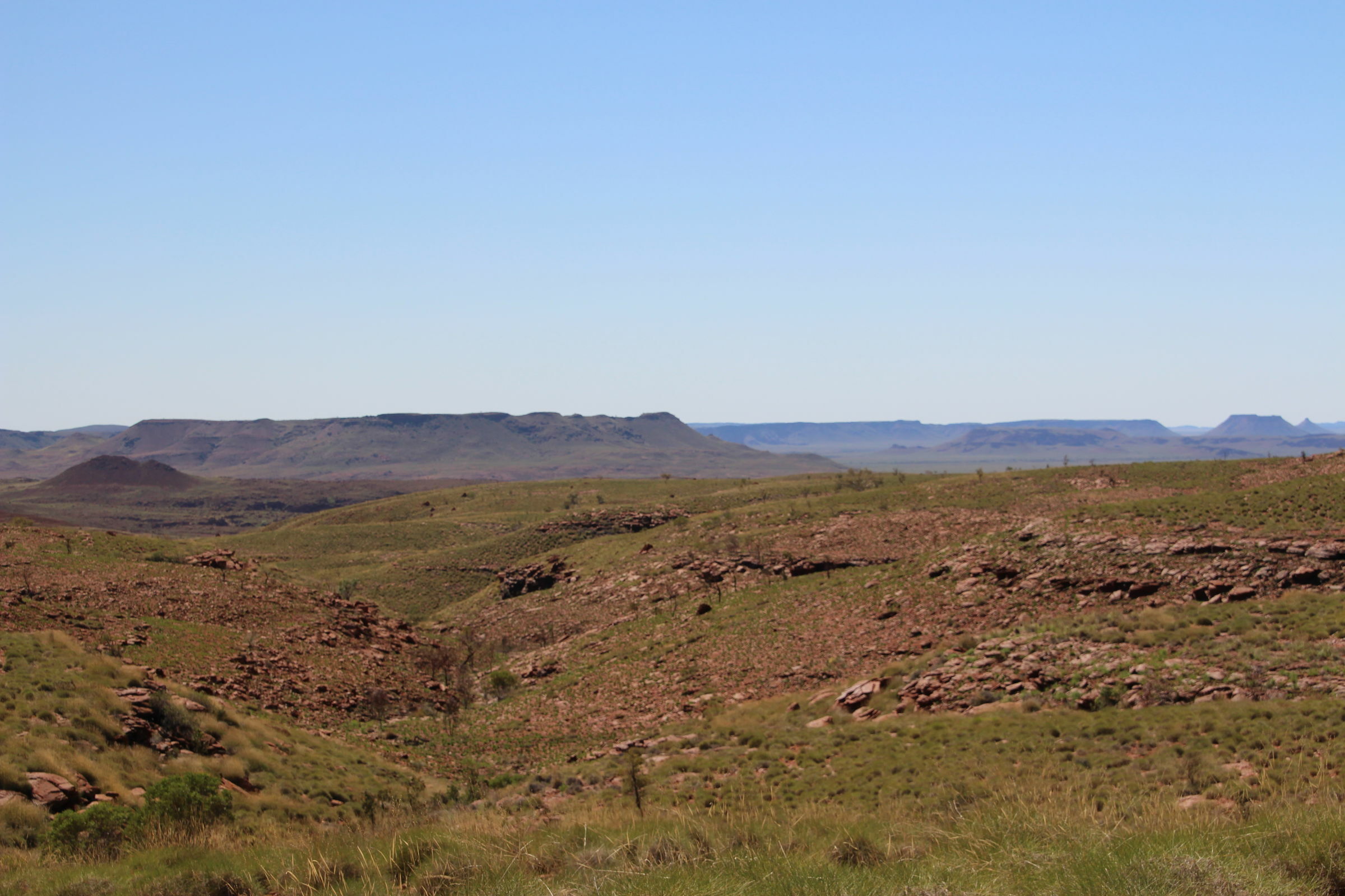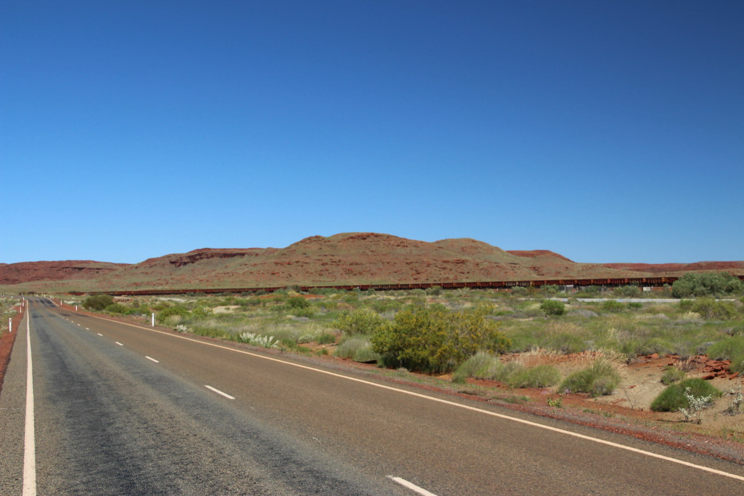 Wir fahren wieder durch eine schöne Landschaft. Es wird hügelig und etwas bergig. Und dürr, nur unten am Grund der kleinen Täler hat es grössere Bäume und Sträucher. Und immer begleitet uns die Minenbahn. Wir begegnen wieder ein paar dieser gigantischen Kompositionen. Ab Nationalparkgrenze ist auch die Hauptstrasse ungeteert. Kiara kriegt einen Schreianfall, bei dem nichts hilft. Wir fahren schliesslich weiter und stimmen ein dreiphoniges "Lalala" an und sie schläft unmittelbar ein. Deswegen oder trotzdem?