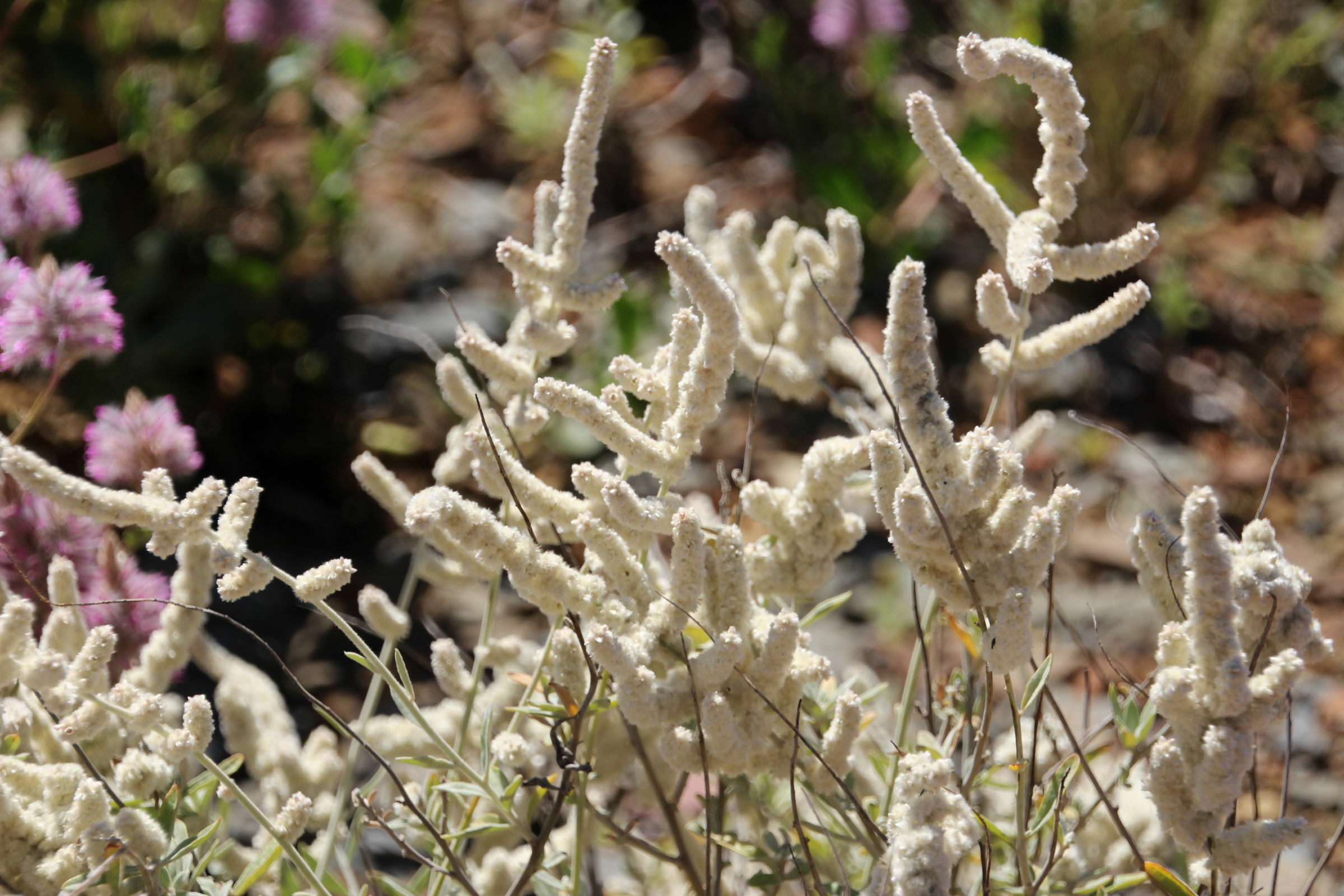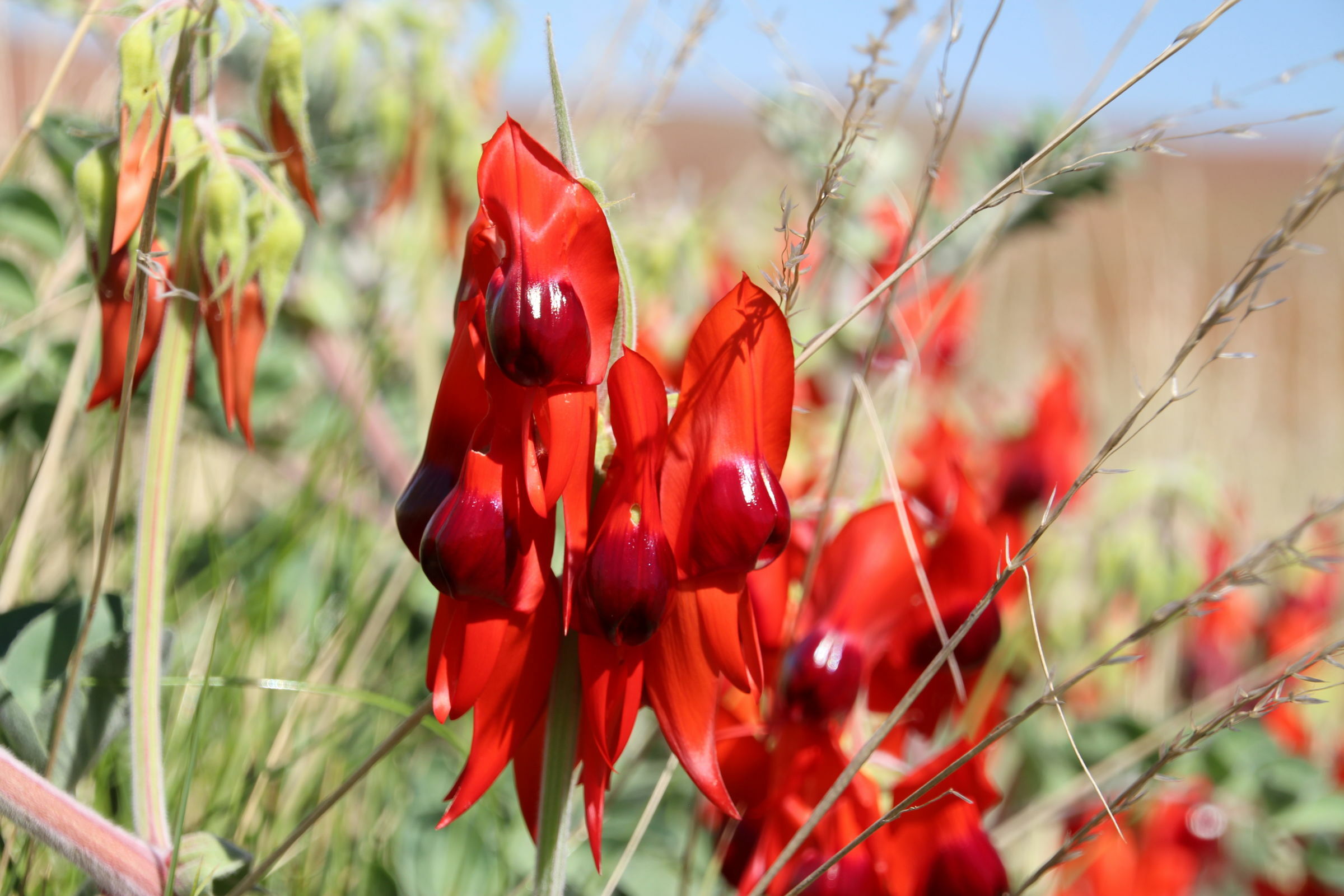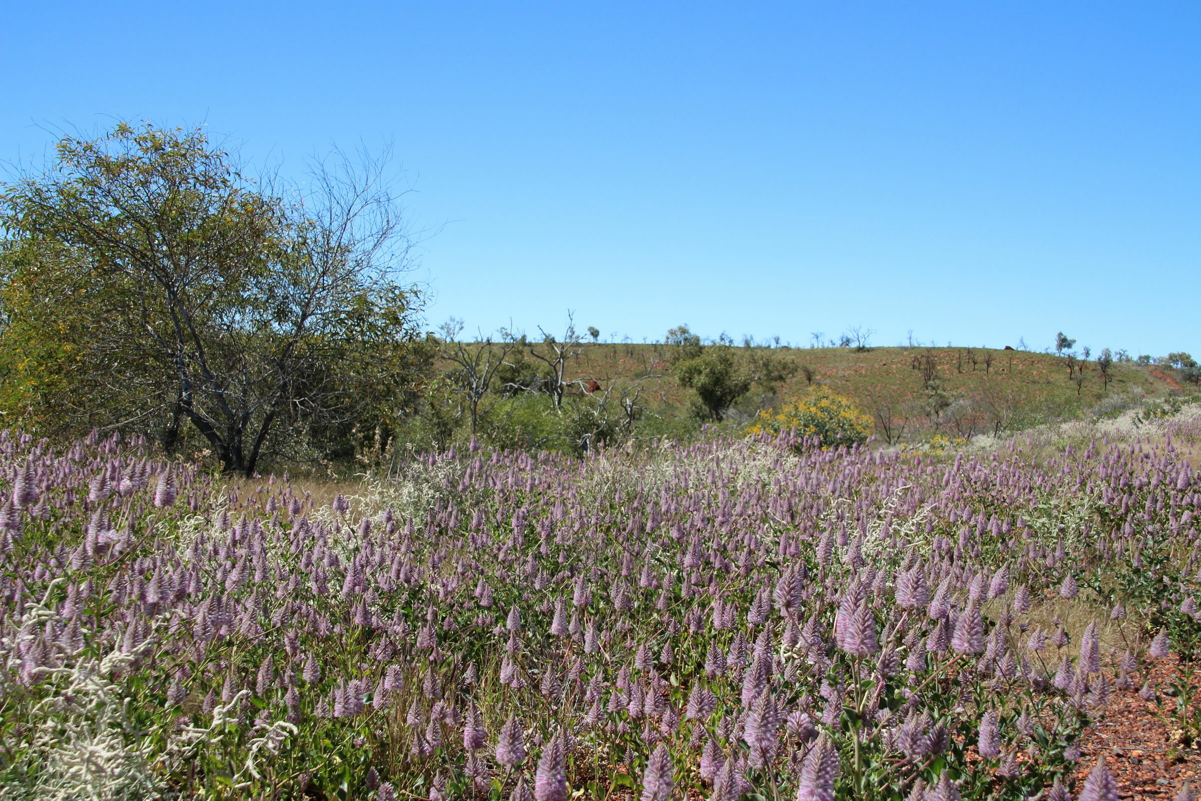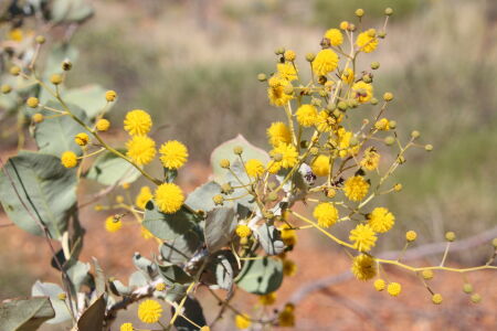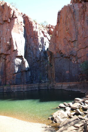 Zuerst gehen wir in die Chichester Range zum Python Pool. Auf dem Weg fällt uns die Desert Pea auf mit seinen grossen roten Blüten. Und auch der Kängeruhdorn. Diese Mimosenart hat Petra zum Geburtstag bekommen. Und hat sich dann sehr mimosenhaft benommen. Trotz Sonnenplatz und öfterem giessen ist sie sehr schnell verdorrt. Diesen Büschen mit gelben Bällchen als Blüten geht es hier bedeutend besser, trotz Trockenheit. Der Python Pool selber ist ein hübsch in der Bergflanke eingegrabenes Becken, welches ganzjährig Wasser hat und früher von Kamelkarawanen als Wasserloch verwendet wurde. Aber es fliesst jetzt schon kein Wasser mehr hinein noch hinaus.