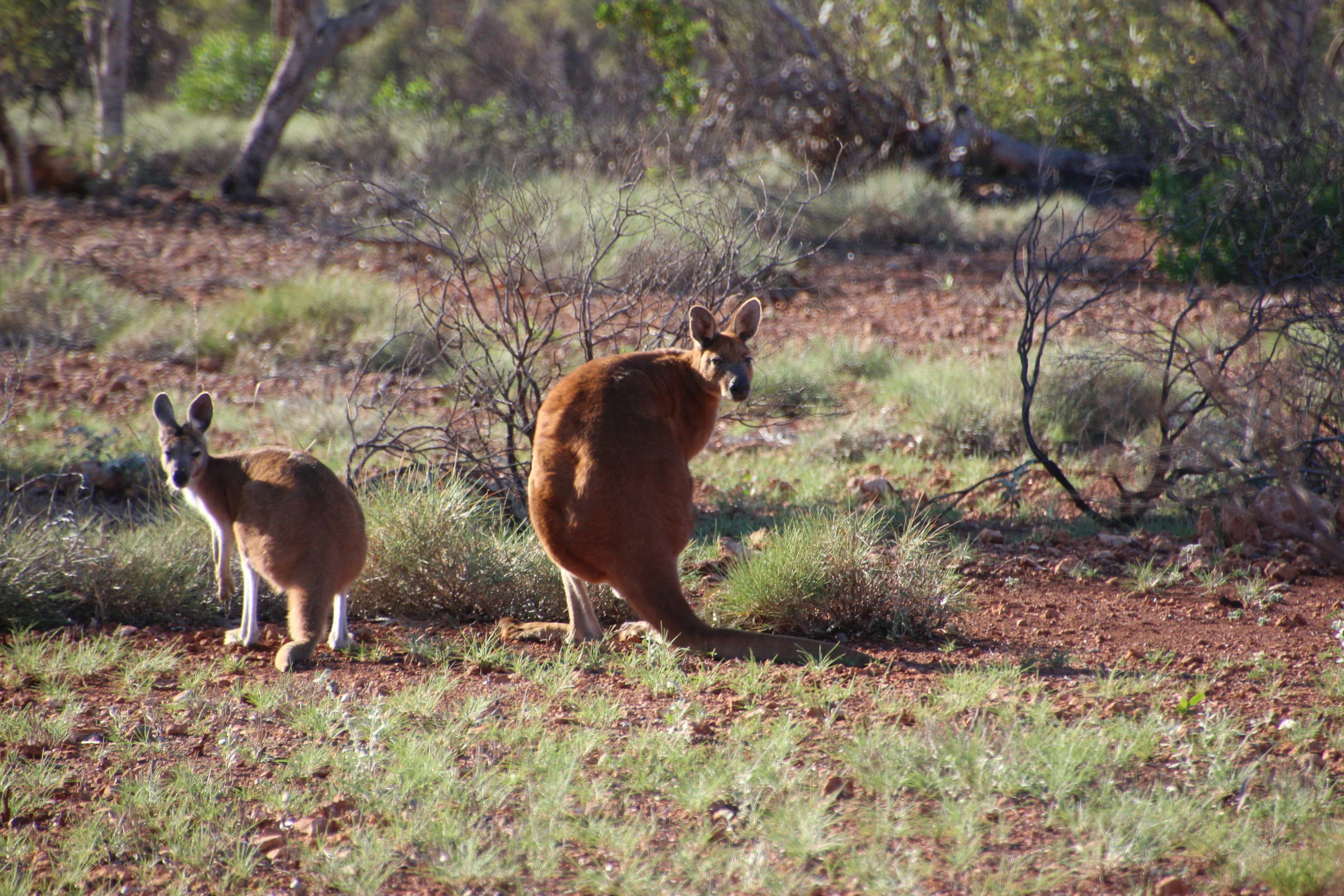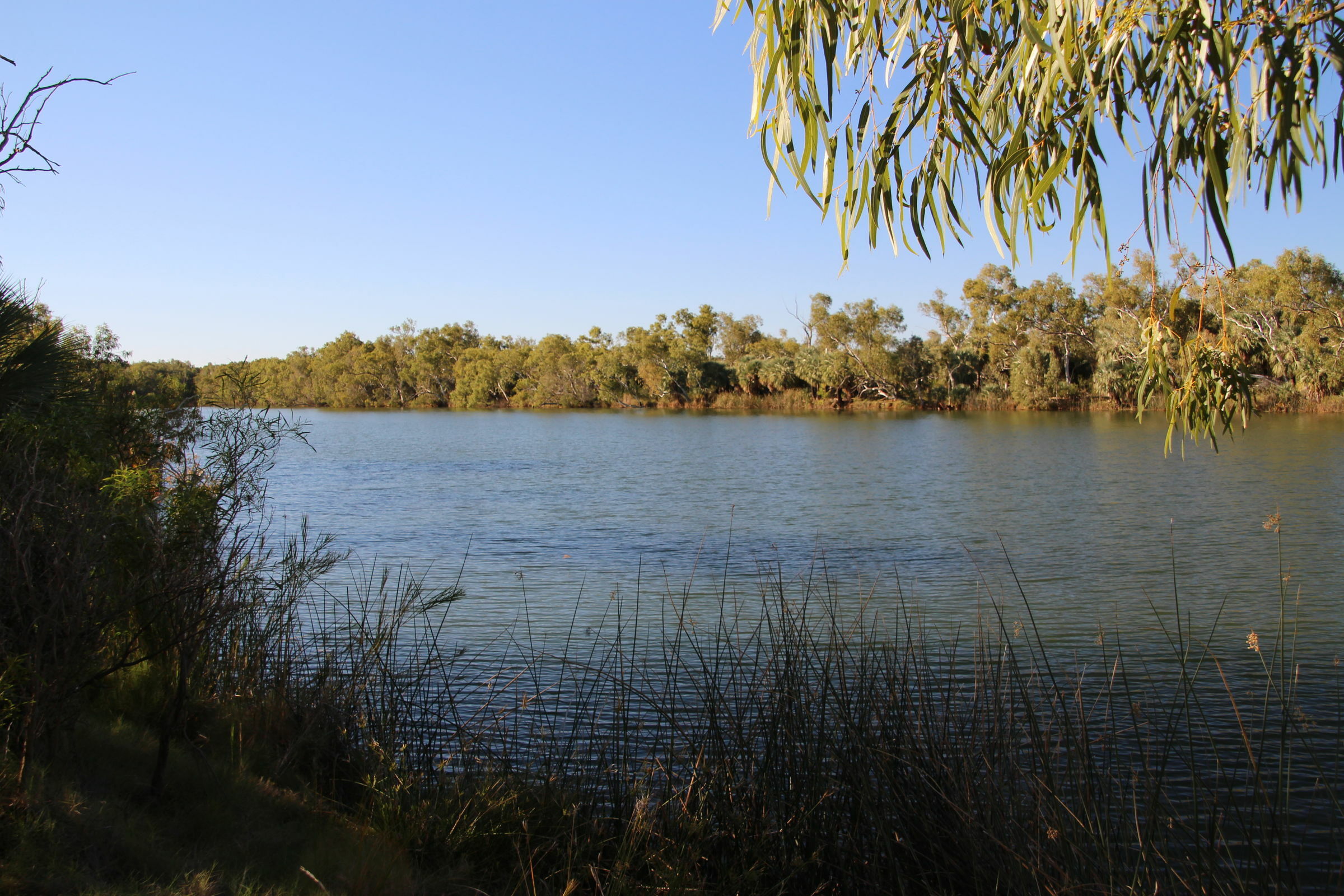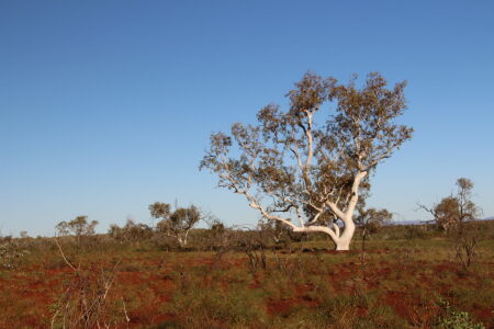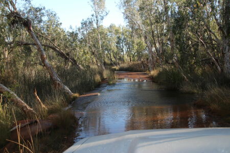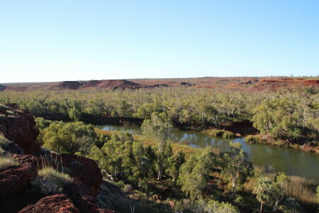 Nachher fahren wir in den Millstream-Bereich. Hier ist es grüner, in der Schwemmebene vom Fortescue River fahren wir sogar durch so etwas wie einen Wald. Wir geniessen den Ausblick über den Fluss und bleiben dann im nahegelegenen Camping. Hier gibt es etwas neues, dass ins Auge sticht: Der Snappy Gum. Diese Bäume haben eine weisse Rinde und leuchten geradezu im Sonnenlicht. Als dieses langsam verschwindet sehen wir einen grossen Schwarm Kakadus eine oder zwei Runden drehen, laut diskutierend welches jetzt der beste Schlafbaum wäre. Als Petra vor dem zu Bett gehen auf die Toilette geht, verscheucht sie noch zwei Kängurus, oder ähnliches. Ich höre nur ein kräftiges, entschwindendes Hüpfen. Und ein Froschkonzert.