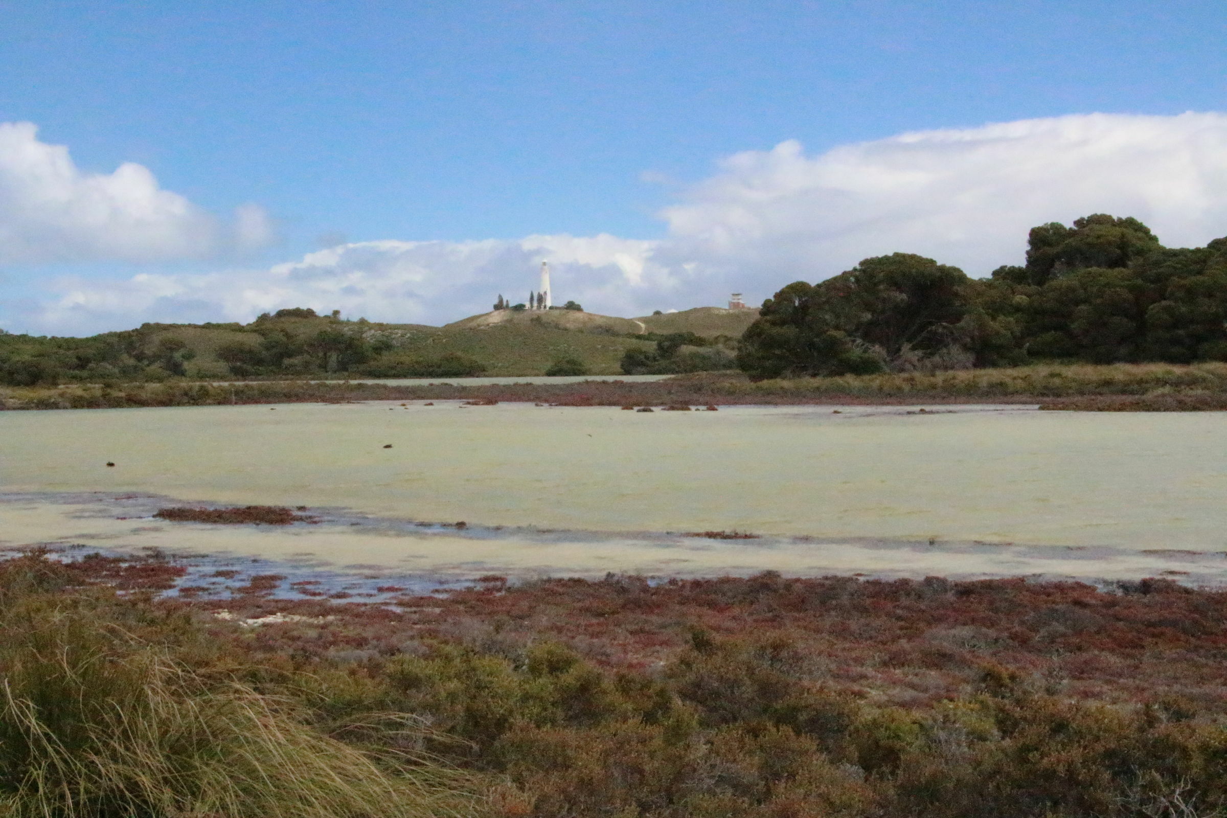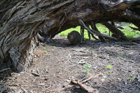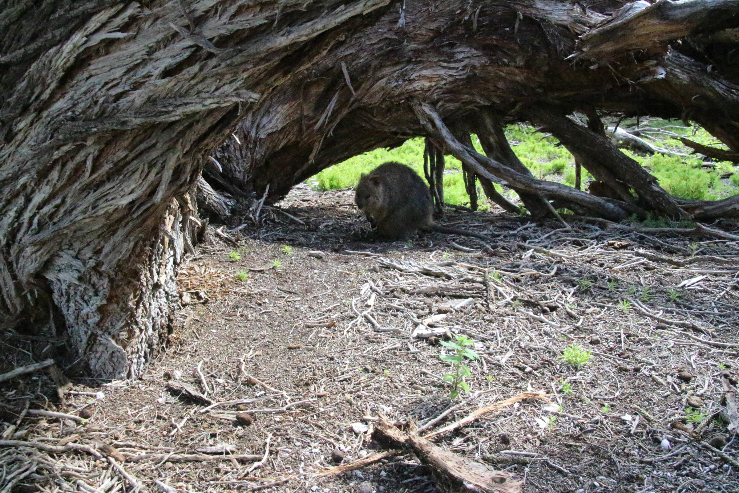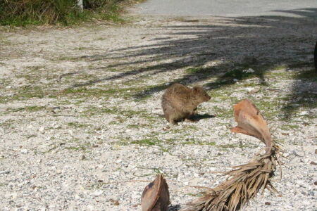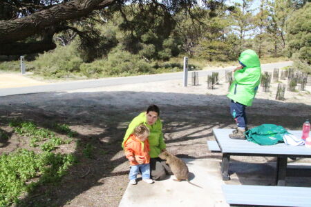 Wir fahren dann doch durch das Inland zur nördlichen Seite der Insel. Hier ist die Landschaft ganz anders als an der Küste. Auch die Salzseen sind reizvoll. Wir finden ein Picknicktisch schön im Schatten und ohne Wind bei einem umgefallenen Baum. Ich nehme Platz und fange an auszupacken. Da schauen mich plötzlich zwei braune Augen von unten an: ein Quokka! So ein Frechdachs! Die Quokkas sind die eigentlich wichtigste Attraktion von Rottnest Island. Hier gibt es keine Ratten oder importierten Raubtiere (Füchse, Katzen und Hunde) und so konnte sich die Population hier halten. In gewissen Gebieten, die wir auf unserer Reise passiert haben, wurde vor giftigen Ködern gewarnt mit denen diese fremden Streuner reduziert werden. So ein Quokka sieht aus wie eine Bisamratte mit Kängurufüssen. Und ganz in der Nähe wartet noch ein zweites Exemplar, eine Mama mit Bébé im Beutel. Jann findet diese Aufdringlichkeit gar nicht gut und flüchtet in Panik auf den Tisch. Für den Moment lassen wir unsere Erziehungsgrundsätze Erziehungsgrundsätze sein und lassen ihn auf dem Tisch essen. Kiara sitzt bei mir auf dem Schoss und stört sich nicht daran, dass das Tierchen an ihrem Bein schnüffelt. Da es Wildtiere sind, sollte man sie weder füttern noch anfassen. Wegen dem Futter sind sie vermutlich her (sie kriegen aber keins) und beim Thema Anfassen hat mich Petra schon vorgewarnt dass diese Tiere diese Regel nicht kennen. Wir geniessen unsere zwei Beobachter.