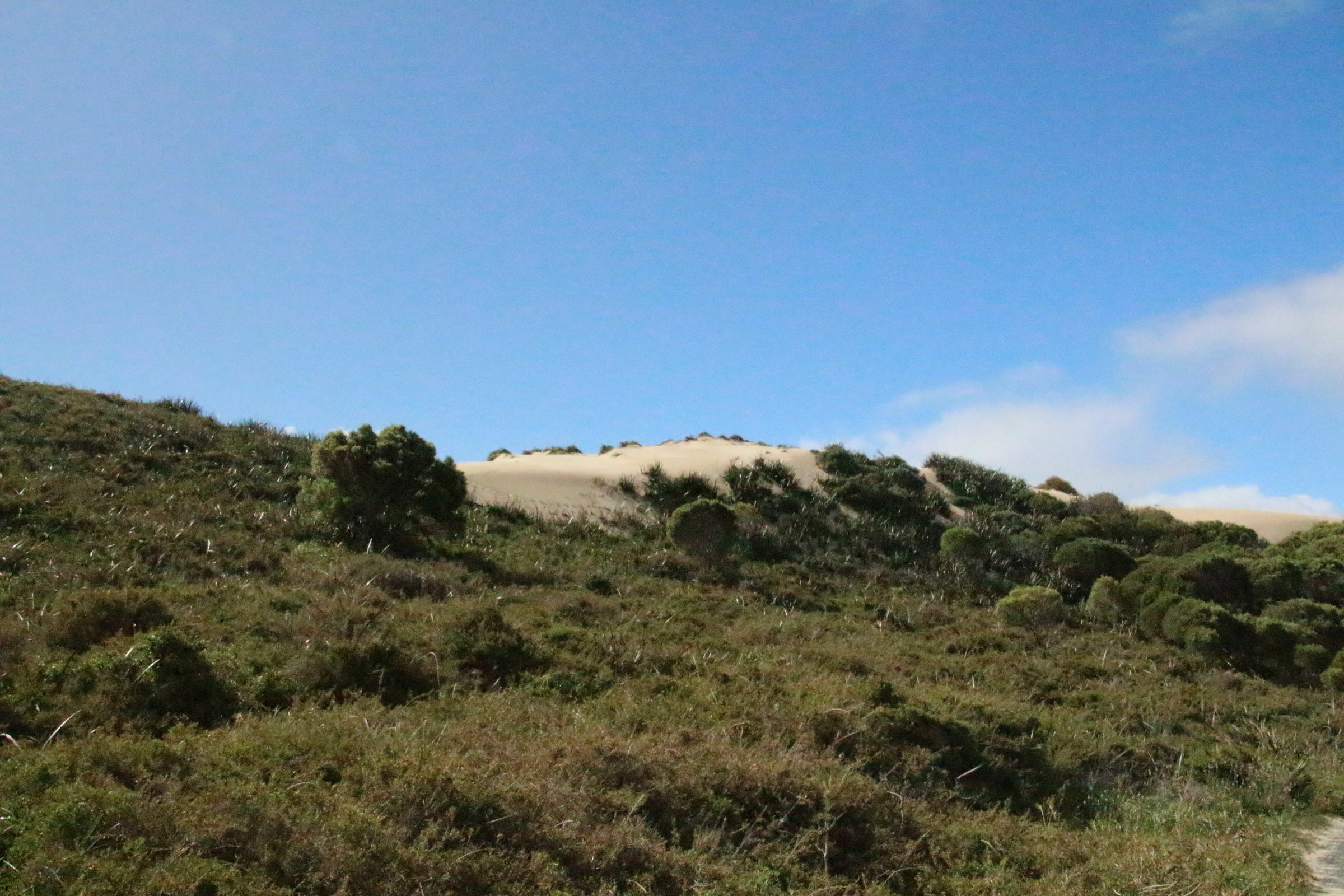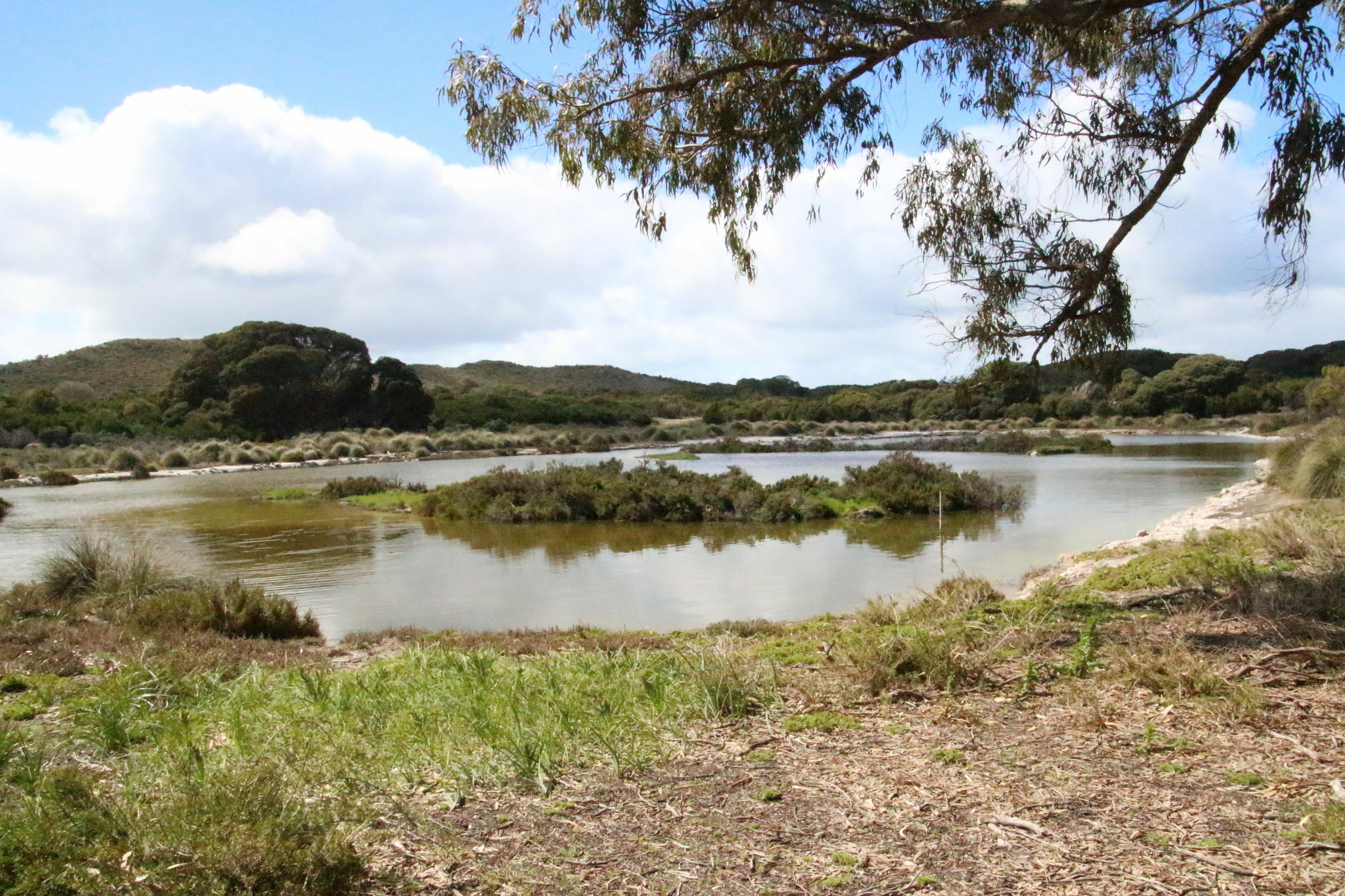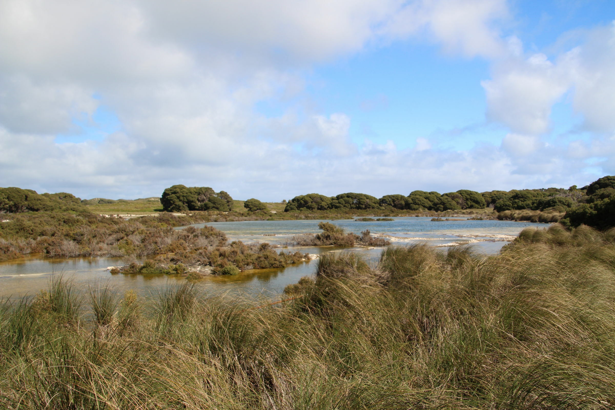 Wir fahren dann doch durch das Inland zur nördlichen Seite der Insel. Hier ist die Landschaft ganz anders als an der Küste. Auch die Salzseen sind reizvoll. Wir finden ein Picknicktisch schön im Schatten und ohne Wind bei einem umgefallenen Baum. Ich nehme Platz und fange an auszupacken. Da schauen mich plötzlich zwei braune Augen von unten an: ein Quokka! So ein Frechdachs! Die Quokkas sind die eigentlich wichtigste Attraktion von Rottnest Island. Hier gibt es keine Ratten oder importierten Raubtiere (Füchse, Katzen und Hunde) und so konnte sich die Population hier halten. In gewissen Gebieten, die wir auf unserer Reise passiert haben, wurde vor giftigen Ködern gewarnt mit denen diese fremden Streuner reduziert werden. So ein Quokka sieht aus wie eine Bisamratte mit Kängurufüssen. Und ganz in der Nähe wartet noch ein zweites Exemplar, eine Mama mit Bébé im Beutel. Jann findet diese Aufdringlichkeit gar nicht gut und flüchtet in Panik auf den Tisch. Für den Moment lassen wir unsere Erziehungsgrundsätze Erziehungsgrundsätze sein und lassen ihn auf dem Tisch essen. Kiara sitzt bei mir auf dem Schoss und stört sich nicht daran, dass das Tierchen an ihrem Bein schnüffelt. Da es Wildtiere sind, sollte man sie weder füttern noch anfassen. Wegen dem Futter sind sie vermutlich her (sie kriegen aber keins) und beim Thema Anfassen hat mich Petra schon vorgewarnt dass diese Tiere diese Regel nicht kennen. Wir geniessen unsere zwei Beobachter.