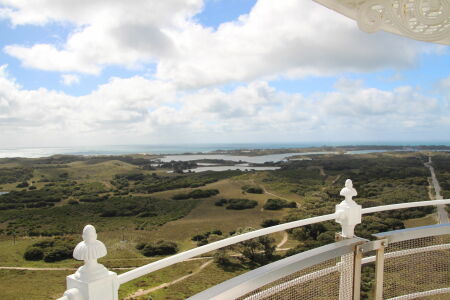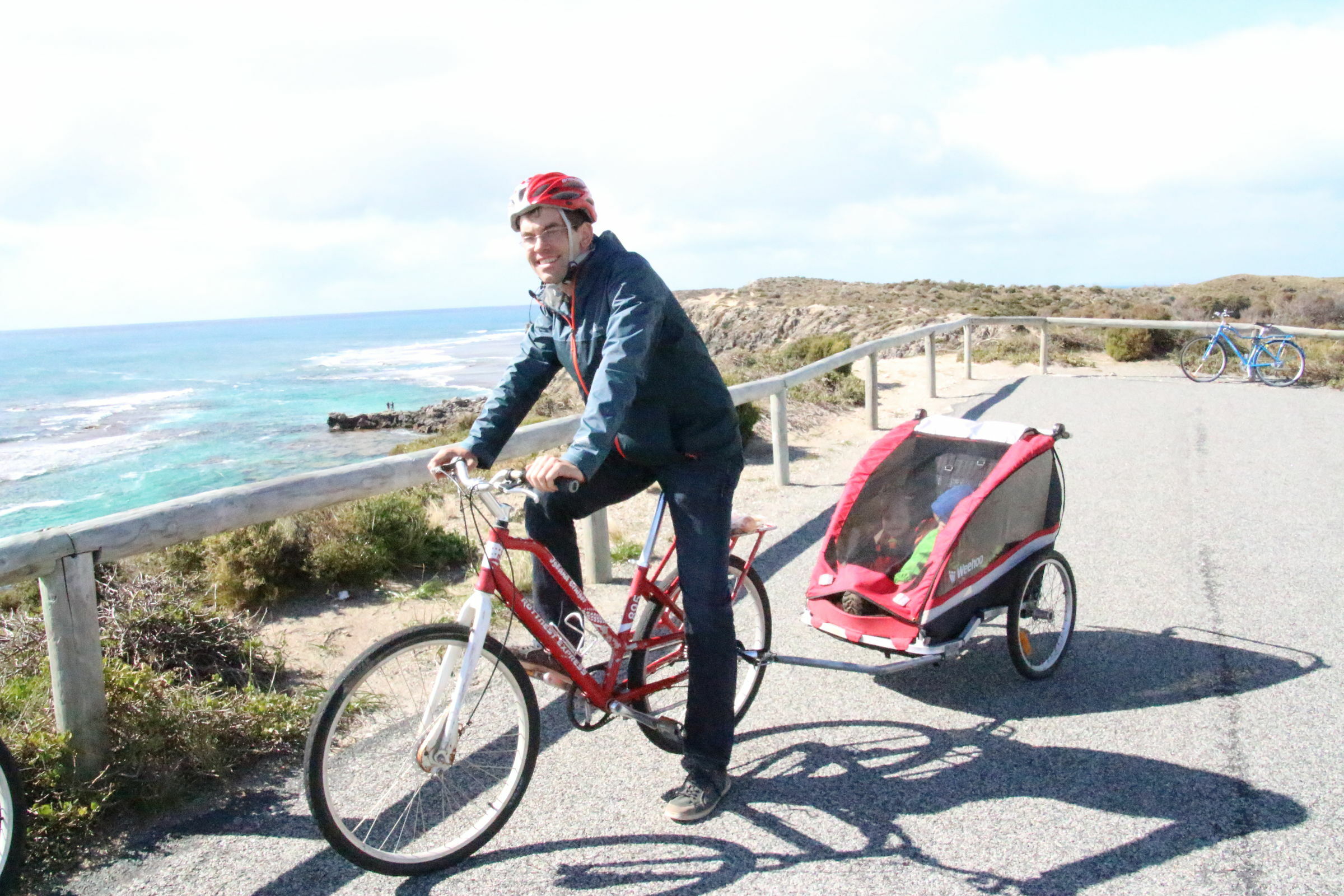 Wir haben zwei Fahrräder und einen Anhänger für die Kinder gebucht. Die Fähre hat die mitgenommen, wir bekommen diese auf dem Pier. Auf der kleinen Insel gibt es keine Autos, nur ein paar Linienbusse. Schon bald verlassen wir die kleine Siedlung und fahren im Uhrzeigersinn um die Insel. Es gibt einen Spritzer Regen um uns zu erschrecken, aber der ist vorbei sobald ich den Anhänger regendicht gemacht habe. Unsere Velos haben nur drei Gänge, was die zum Glück nur kleinen Aufstiege mit 30 kg Zusatzgewicht ziemlich anstrengend macht. Wir halten hie und da bei einer Bucht und nach etwa einem Drittel sind wir uns nicht einig. Ich will um die ganze Insel fahren (sind total nur 22 km), aber Petra will die Abkürzung in der Mitte durch nehmen. Fahren wir zuerst Mal hoch zum Leuchtturm, der von der höchsten Erhebung über die Insel thront. Ich gebe mir alle Mühe, aber die letzten 15 Meter sind dann zu viel und ich muss absteigen. Den Kindern ist dass alles egal, die schlafen. Petra nimmt an einer Führung im Leuchtturm teil, die gerade startet.