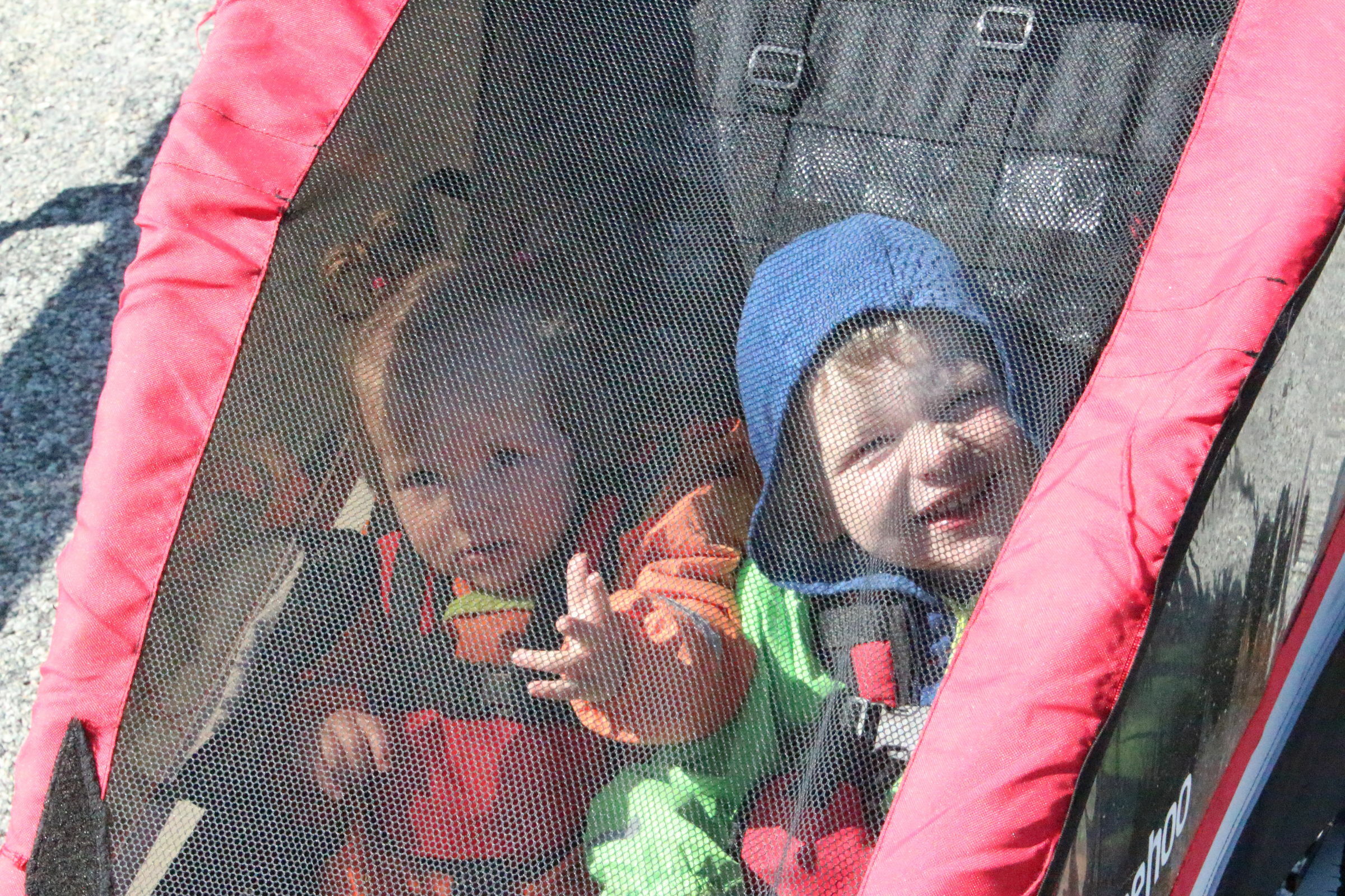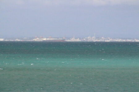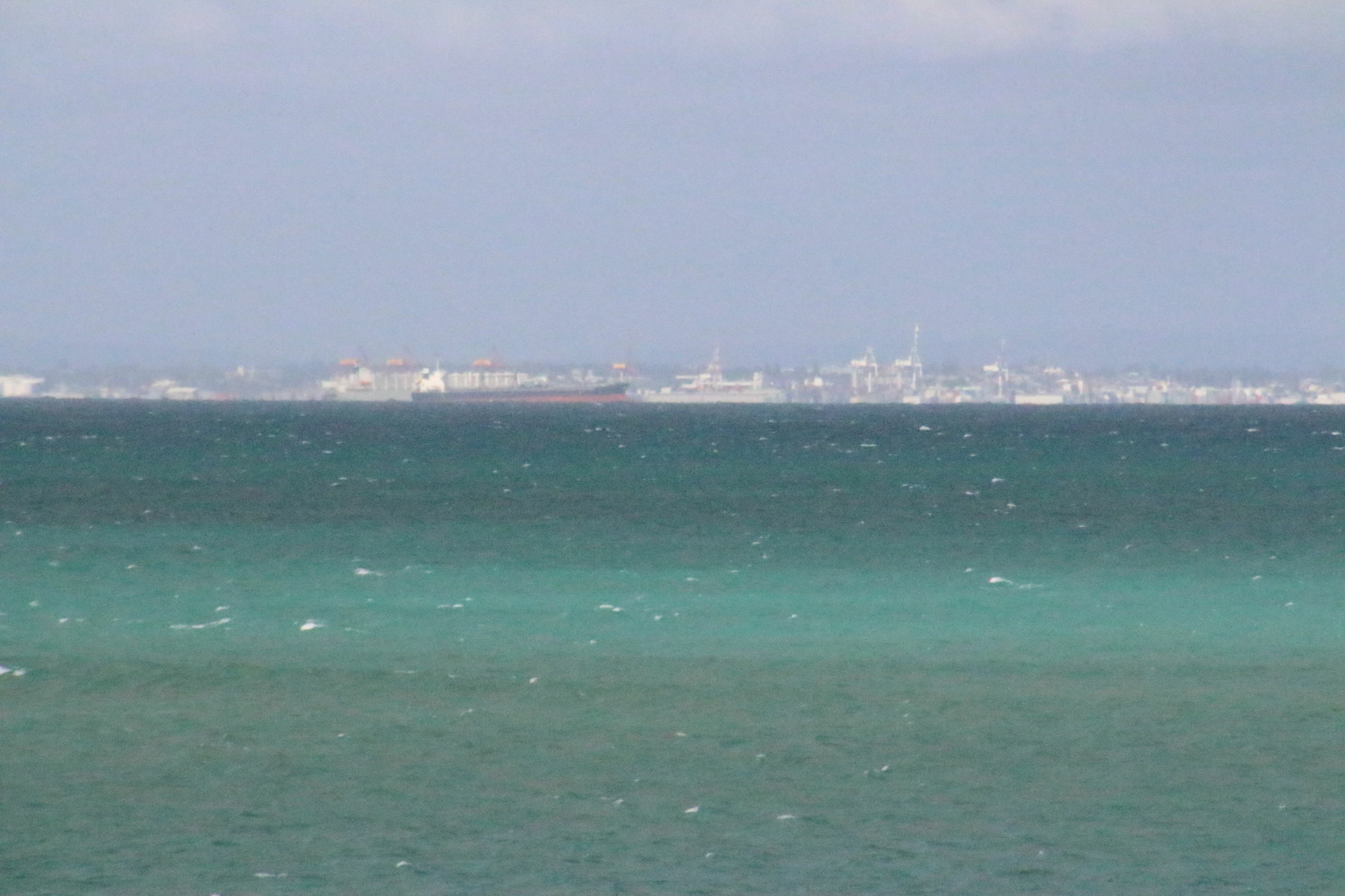 Kiara gefällt das Auf und Ab. Sie will sich gar nicht festhalten lassen obwohl sie sich gar nicht richtig auf den Beinen halten kann. Jann wird verdächtig ruhig. Wir denken dass er seekrank ist. Wir passieren ein paar grosse Frachter, die leer im Meer vor dem Hafen auf bessere Zeiten warten, und sind nach weniger als einer halben Stunde Fahrt auf der Insel.