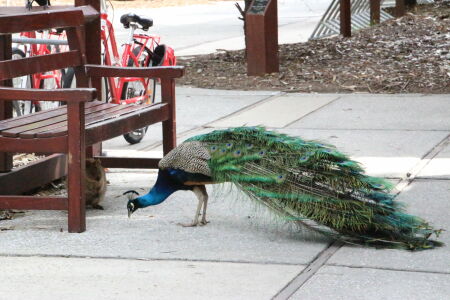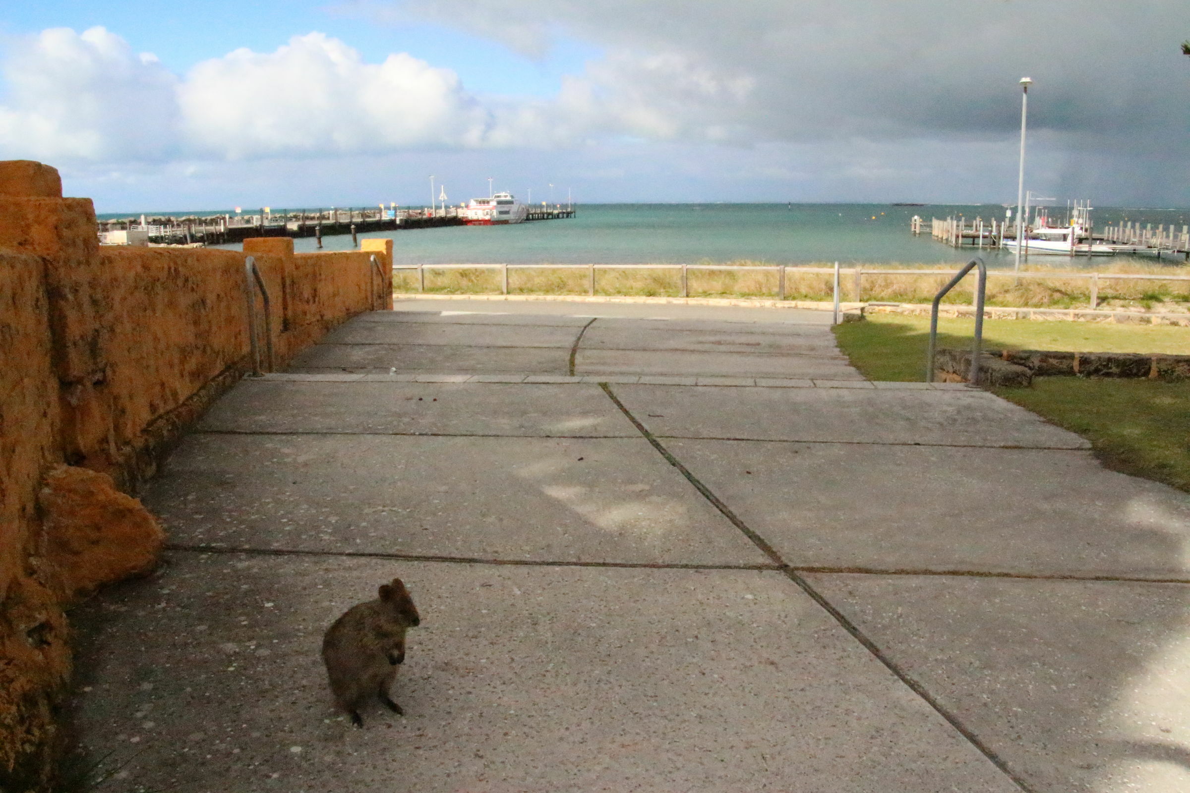 Langsam geht es zurück in Richtung Hafen. Gegen Schluss in bewohntem Gebiet sehen wir dann noch ein oder zwei Tierchen. Petra erwartet noch mehr, den am Nachmittag sollten sie da herumtreiben. In der Fussgängerzone hat es wirklich ein paar. Und man sieht auch, warum man sie nicht Füttern sollte. Ein Pfau wird aggressiv gegenüber einem Tier im Kampf ums Fressen. Nach den Ohrmarkierungen zu schliessen hat er schon die eine oder andere Begegnung verloren. Der Pfau wird dann später von einer Möwengang angegangen. Ein weiteres Quokka hat ein totes Auge. Jann taut nun gegenüber diesen Tieren auf flüchtet nicht mehr. Wenn ich nun Kiara aber alleine auf Augenhöhe mit einem Tier lasse, dann ist ihr aber auch nicht wohl.