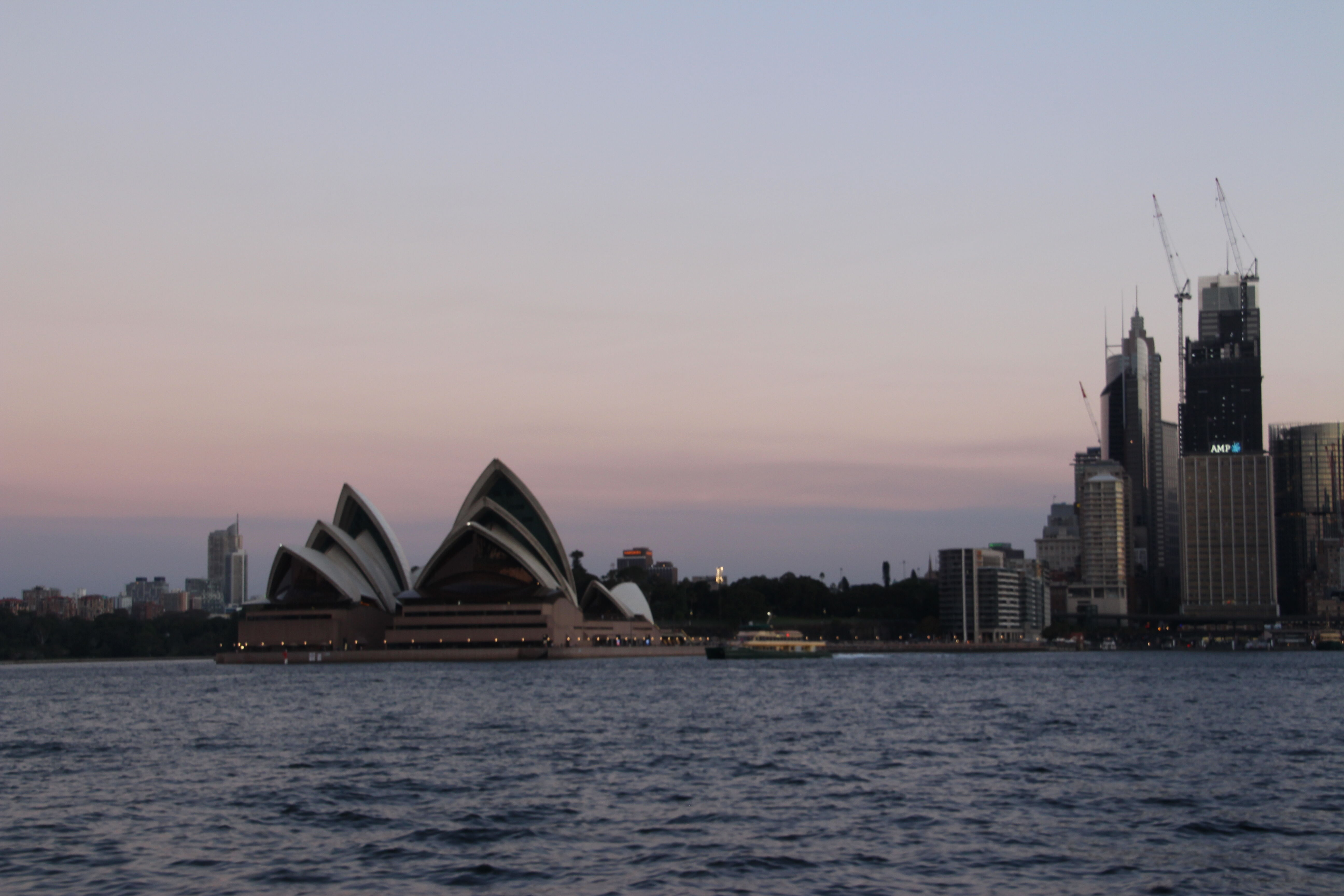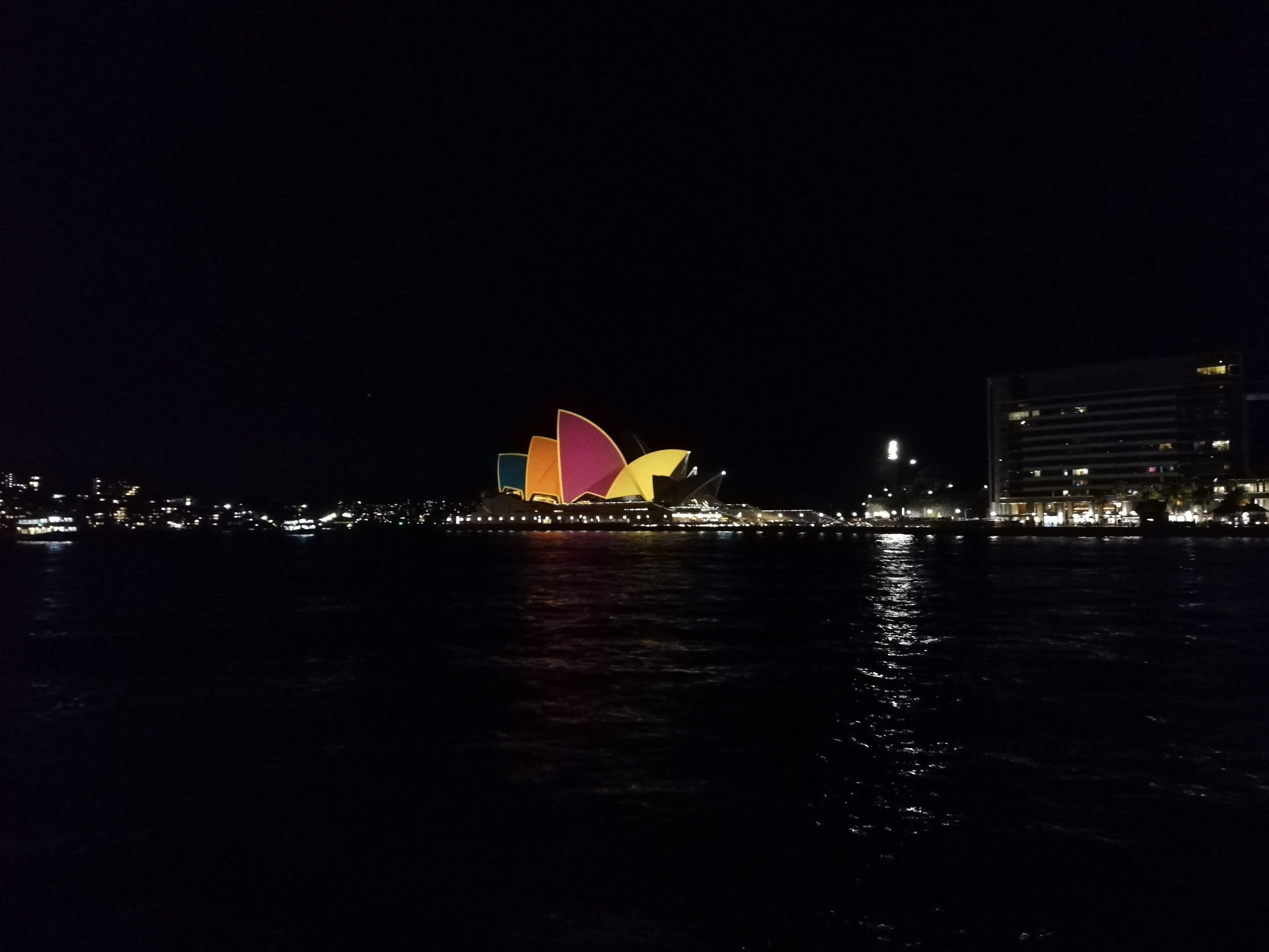 Als ich dann von den Rocks zurück zu meiner Bushaltestelle lief, war die Oper sehr wohl beleuchtet, einfach nur auf der Westseite. Es wurden unterschiedliche Farben auf jedes der segelförmigen Dächer projeziert. Wie wir später herausgefunden haben sind dies die Farben von Sri Lanka im Gedenken an die schrecklichen Anschläge.
